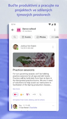 Transformujte svoje plány na úspešné projekty vďaka pokročilým nástrojom pre spoluprácu. Rýchlo a bez námahy zdieľajte fotografie a videá priamo v chatoch. Využívajte cloudové úložisko pre prístup k spoločným dokumentom a súborom na cestách a udržujte všetok zdieľaný obsah – udalosti, fotografie, odkazy – prehľadne usporiadaný v rámci vašej komunity. Zvýšte efektivitu stretnutí pomocou zdieľania obrazovky, interaktívnej tabule a virtuálnych miestností. S prehľadnými zoznammi úloh môžete prideľovať úlohy, nastavovať termíny a sledovať pokrok, aby bol celý tím vždy v obraze.