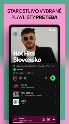 Ponorte sa do neobmedzeného sveta zvuku so Spotify, kde na vás čakajú milióny skladieb, albumov a pútavých podcastov. Objavujte novú hudbu a podmanivé príbehy, ktoré rezonujú s vašou náladou či aktivitou, a to všetko vďaka rozsiahlej knižnici prispôsobenej presne pre váš vkus. Vytvárajte a zdieľajte vlastné playlisty alebo sa nechajte prekvapiť kurátorovanými výbermi, ktoré Spotify pripravuje špeciálne pre vás. S nami je hľadanie obľúbených interpretov a objavovanie budúcich hitov jednoduchšie ako kedykoľvek predtým.