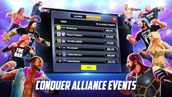 Rozšírte svoj tím superhviezd a strategicky ich spravujte, aby ste využili synergické bonusy založené na ich príslušnosti k tímu a vzťahom vo svete WWE. Vyberte si zo šiestich unikátnych tried postáv – BRAWLER, HIGH FLYER, POWERHOUSE, TECHNICIAN, WILDCARD a SHOWMAN – pričom každá prináša jedinečné silné stránky a výhody do súboja. Vstúpte do akcie v rámci týždenných výziev WWE RAW, NXT a SmackDown Live, súťažte v tímových zápasoch (TAG-TEAM) a zúčastňujte sa udalostí zosúladených s reálnymi šou, ako sú Monday Night RAW či Clash of Champions. Zvráťte priebeh bitky pomocou dokonale načasovaných protiútokov a premeňte zdanlivú prehru na triumf!